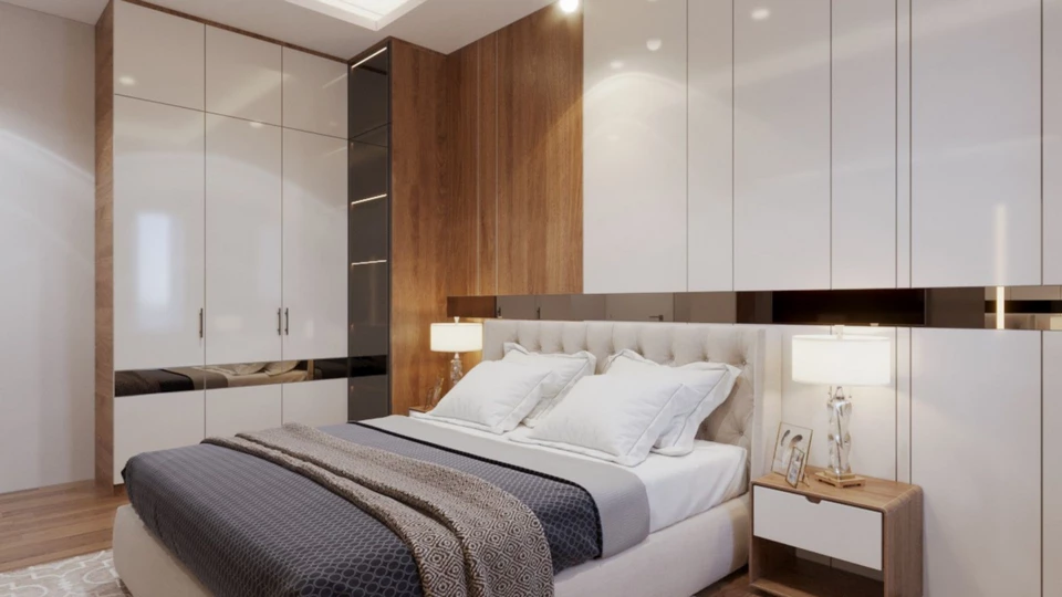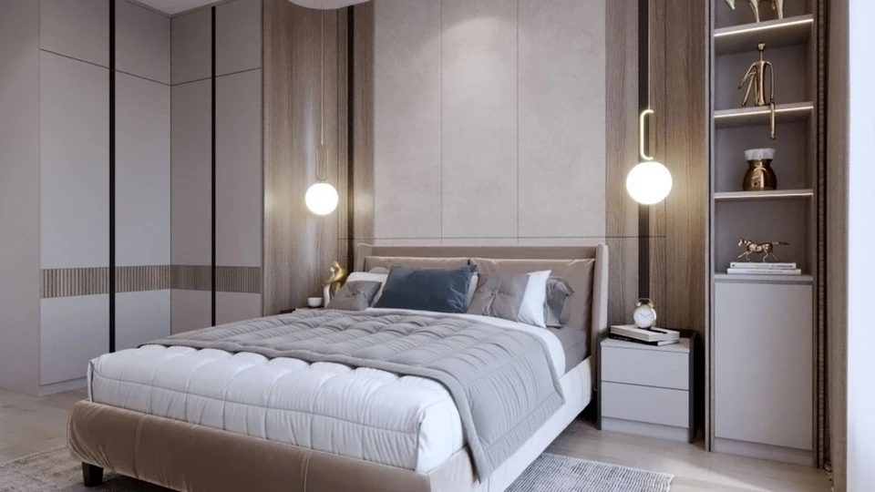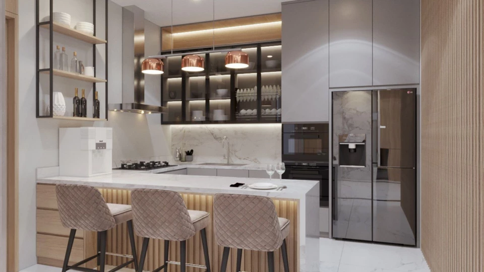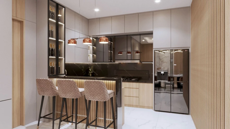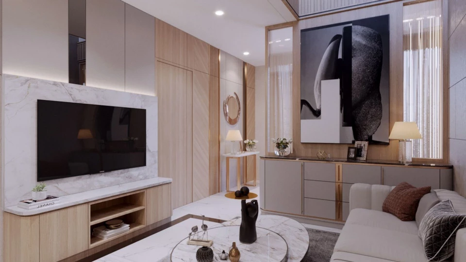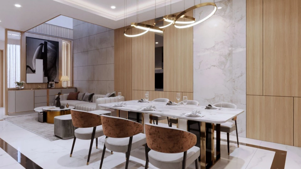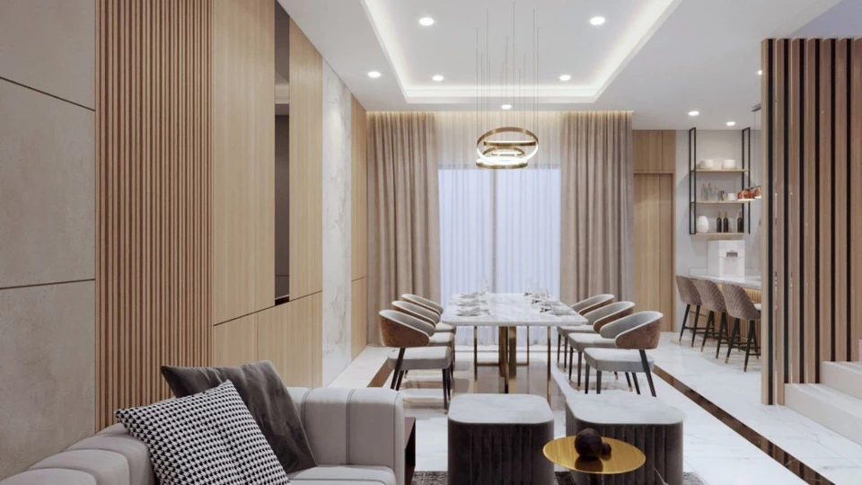 This luxurious living and dining space showcases a sophisticated blend of modern and natural elements, featuring warm wood paneling, marble flooring, and elegant furnishings. The open layout seamlessly connects the living area to the dining space, where a sleek marble dining table is complemented by plush upholstered chairs. Subtle lighting, including a statement pendant light above the dining table, enhances the ambiance, while floor-to-ceiling curtains add a touch of elegance.
