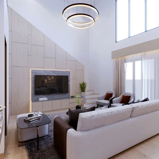 The focal point is the built-in TV wall with light wood paneling and subtle backlighting, adding depth and elegance. Large windows allow plenty of natural light, complemented by sheer curtains for a soft, airy feel. The seating arrangement consists of a comfortable white sofa paired with two accent chairs, creating a cozy and functional gathering area.