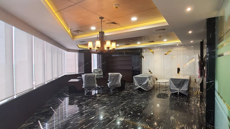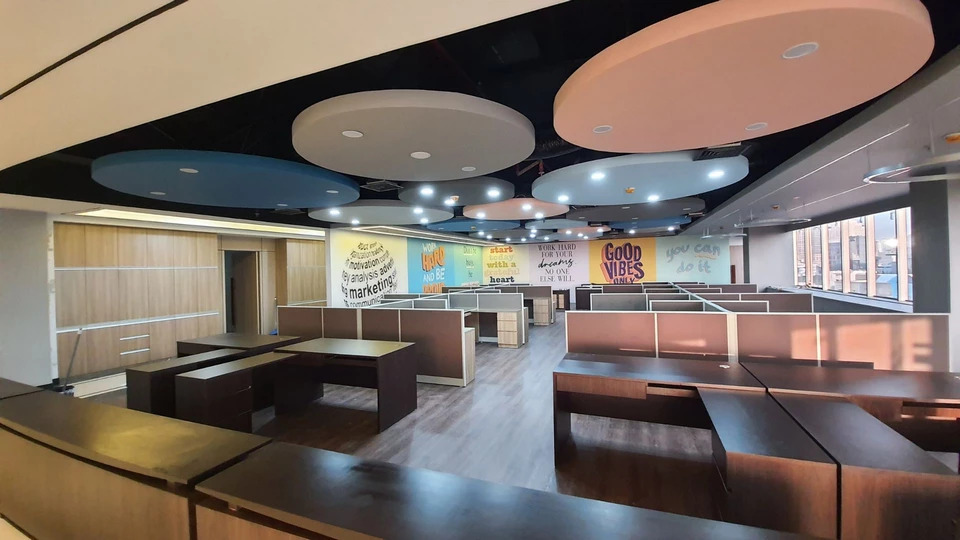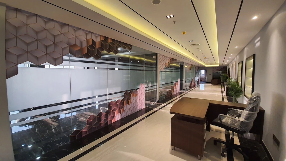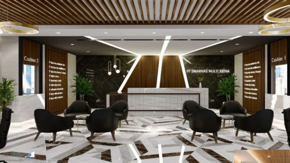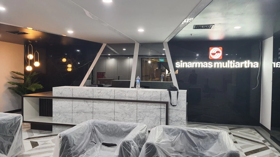 The Sinarmas Finance Multi Artha office interior is designed to reflect professionalism, efficiency, and corporate elegance while maintaining a welcoming atmosphere for employees and visitors. The Sinarmas logo and corporate colors are prominently displayed at the reception area, reinforcing brand recognition.